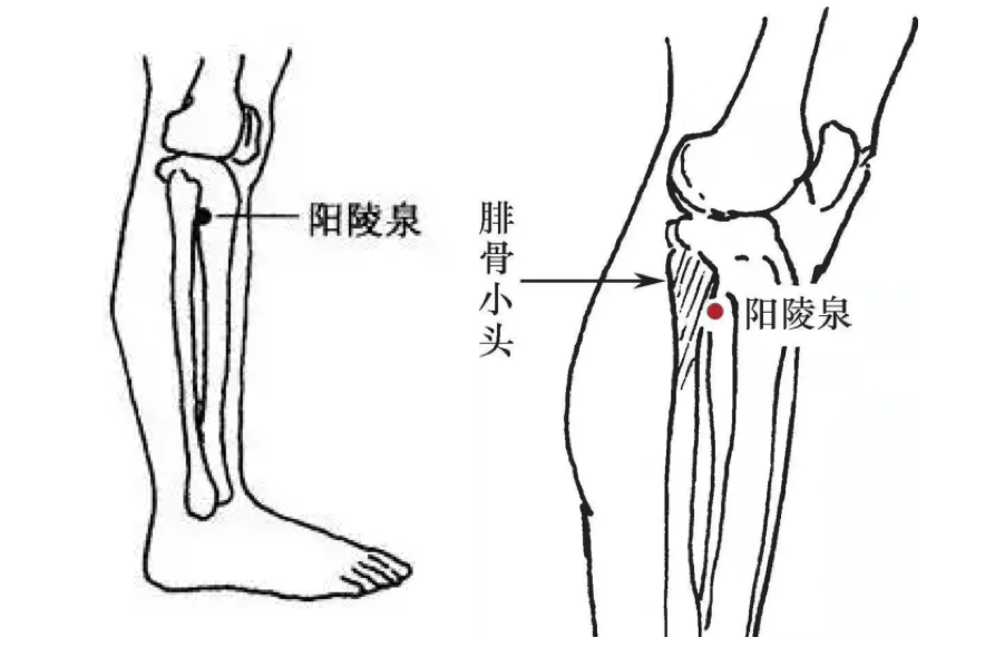 จุดหยางหลิงเฉวียน จุดนี้อยู่บริเวณหน้าแข้งด้านนอก ด้านข้างกระดูก Fibula เฉียงลงด้านหน้าจะมีรอยบุ๋ม