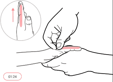 วิธีการ : ใช้นิ้วหัวแม่มือหรือนิ้วชี้ ลูบจากบริเวณโคนนิ้วโป้ง (ระหว่างนิ้วโป้งกับนิ้วชี้) ไปยังปลายนิ้วชี้ (ด้านติดนิ้วหัวแม่มือ) ทำต่อเนื่องครั้งละ 3–5 นาที