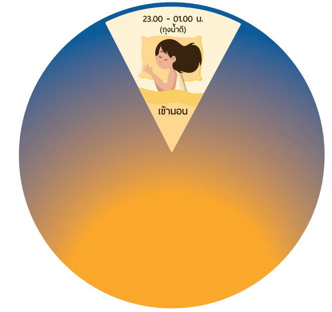 คือ ช่วงเวลาระหว่าง 23:00 น. - 01:00 น. ซึ่งเป็นช่วงเวลาที่หมอจีนแนะนำว่า "ก่อนยามจื่อต้องเข้านอน" เพราะเป็นเวลาที่เส้นลมปราณของถุงน้ำดีจะทำหน้าที่ หมายถึง ถุงน้ำดีเก็บน้ำดีที่ได้จากตับและส่งน้ำดีมาช่วยย่อยไขมันที่ลำไส้เล็ก โดยทฤษฏีของศาสตร์การแพทย์แผนจีนนั้นเชื่อว่า ถุงน้ำดีจะทำหน้าที่ในการตัดสินใจ ในช่วงของ "ยามจื่อ" ไขกระดูกจะเริ่มต้นสร้างเลือด และซ่อมแซมร่างกาย และอวัยวะทั้งหมดภายในร่างกายจำเป็นจะต้องพึ่งพาการทำงานของถุงน้ำดี ดังนั้น ยามจื่อจึงเป็นเวลาที่เราควรจะนอนหลับ เพราะการหลั่งของถุงน้ำดีจะส่งผลทำให้สมองโล่ง ปลอดโปร่ง และแจ่มใส ถ้าในยามจื่อเรานอนหลับได้อย่างเต็มที่และเพียงพอ จะทำให้เส้นลมปราณของถุงน้ำดีมีพลัง ทำให้เมื่อเรารู้สึกปลอดโปร่ง แจ่มใส ใต้ตาไม่คล้ำเมื่อตื่นมาในตอนเช้า แต่ถ้าหากเราไม่สามารถเข้านอนก่อนยามจื่อได้ ก็จะทำให้ไฟที่ถุงมีน้ำดีย้อนกลับขึ้นมาด้านบน (胆火上逆) ก่อให้เกิดอาการนอนไม่หลับ ปวดศรีษะ คิดมาก กังวล และเมื่อตื่นขึ้นมาในตอนเช้าก็จะรู้สึกง่วงหงาวหาวนอน งัวเงีย มึนงง ไม่แจ่มใส ใต้ตาก็จะมีสีดำ คล้ำ และในขณะเดียวกันหากเราไม่ได้นอนในยามจื่อ จะทำให้การหลั่งของถุงน้ำดีเกิดความผิดปกติ และง่ายต่อการเกิดโรคนิ่วในถุงน้ำดี