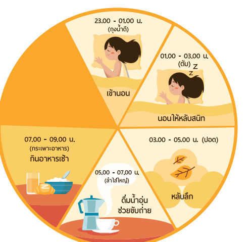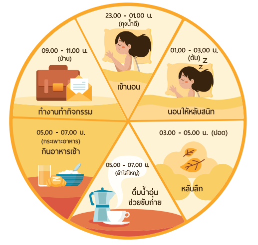 คือ ช่วงเวลาระหว่าง 03:00 น. - 05:00 น. ซึ่งเป็นช่วงเวลาที่หมอจีนแนะนำว่า "ยามอิ่นหลับลึก ปอดเปิดรับพลังบริสุทธิ์" เพราะเป็นช่วงเวลาที่เส้นลมปราณของปอดทำหน้าที่ หมายถึง ปอดเป็นจุดเริ่มต้นและรวบรวมพลังของชี่และเลือด ส่วนตับจะเก็บกักเลือด สลายเซลล์เม็ดเลือดแดง แล้วนำเลือดใหม่ส่งไปยังปอด ปอดจึงเป็นศูนย์รวมหลอดเลือดนับร้อยเพื่อเป็นจุดแลกเปลี่ยนก๊าซออกซิเจน โดยปอดจะส่งก๊าซออกซิเจนไปเลี้ยงทั่วร่างกาย ถือเป็นจุดที่พลังชี่และเลือดเคลื่อนตัว เพื่อให้ระบบหายใจทำงานได้เต็มที่ และเซลล์ต่าง ๆ ภายในร่างกายให้สามารถรับก๊าซออกซิเจนได้อย่างเพียงพอ ช่วงเวลานี้ ถ้าหากนอนหลับได้ลึกจะทำให้เรามีใบหน้าที่สดใส ดูมีเลือดฝาด รู้สึกสดชื่น แจ่มใส และกระปรี้กระเปร่าเมื่อตอนตื่นนอน