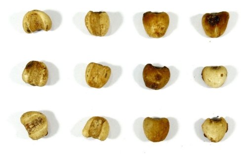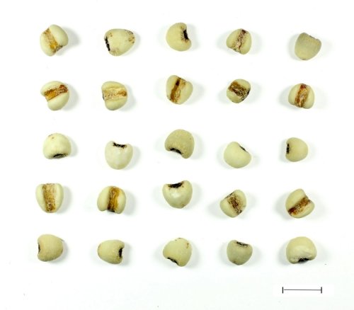 รูปทรงไข่กว้าง หรือทรงกระบอกยาว ผิวสีขาวน้ำนม เกลี้ยงเกลา อาจพบเปลือกเมล็ดสีน้ำตาลอมเหลืองที่หลงเหลืออยู่ ปลายด้านหนึ่งกลมทื่อ อีกด้านค่อนข้างกว้างและมีรอยบุ๋ม มีขั้วเมล็ดเป็นจุดสีน้ำตาลอ่อน 1 จุด ด้านหลังนูนกลม ด้านท้องมีร่องตามยาวที่กว้างและลึก 1 เส้น เนื้อแข็ง หน้าตัดมีสีขาว กลิ่นอ่อน ๆ รสหวานเล็กน้อย