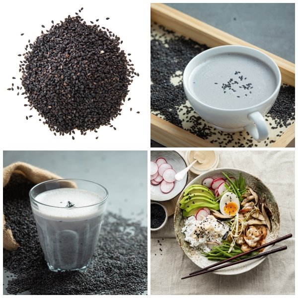 งาดำอุดมด้วยธาตุเหล็ก ช่วยบำรุงเลือด ลดความดันโลหิต ขยายหลอดเลือด และป้องกันเกล็ดเลือดที่จะเกาะตัวกันเป็นลิ่ม