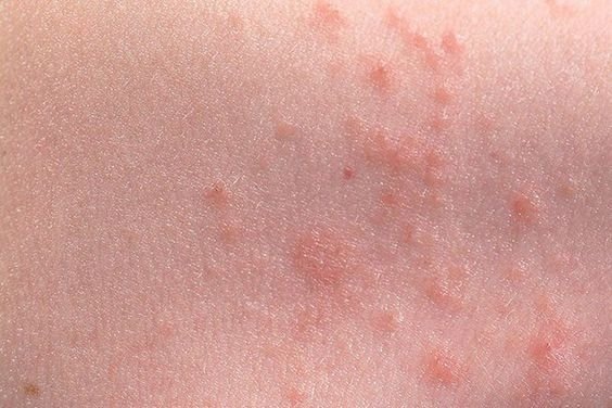 Red rash and red papules combined with itchiness. When the rash pops, the fluid of lymph can be seen occasionally all over body.