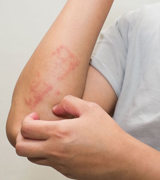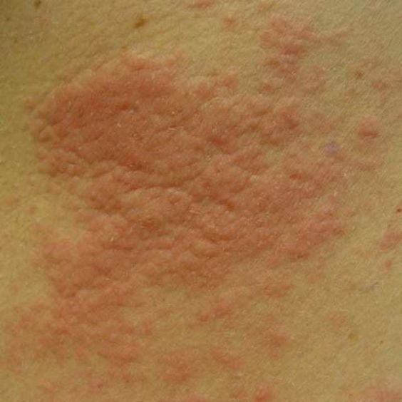 เป็นผื่นหรือปื้นนูนแดงตามร่างกายร่วมกับอาการคันผื่นขึ้นเร็ว ยุบเร็ว มักไม่เกิน 24 ชม. และไม่ทิ้งรอย