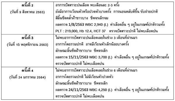 หลังจากที่ได้เริ่มรับประทานยาสมุนไพรจีน ตำรับยาที่มีสรรพคุณบำรุงชี่ม้ามและไต บำรุงเลือดระงับเลือด ประมาณสามเดือนพบว่าอาการปัสสาวะปนเลือดน้อยลง อีกทั้งค่าเลือดกลับเป็นปกติจากตลอด 4 ปีที่ผ่านมามีความผิดปกติของค่าเลือด Hb, HCT, PLT ส่วนค่าเม็ดเลือดขาว WBCก็ดีขึ้นตามลำดับ
