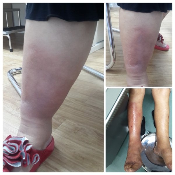 อาการ:เกิดที่ขา บริเวณนั้นบวมแดง ปวดแสบร้อน หรืออาจพบตุ่มน้ำ ปื้นม่วง ถ้าเป็นหนักมีหนองหรือผิวหนังตาย หรือถ้าเป็นซ้ำๆจะทำให้เกิดภาวะเท้าช้างได้ มีอาการอื่นร่วมเช่นมีไข้ เบื่ออาหาร ลิ้นแดง ฝ้าเหลืองเหนียว ชีพจรลื่นเร็ว