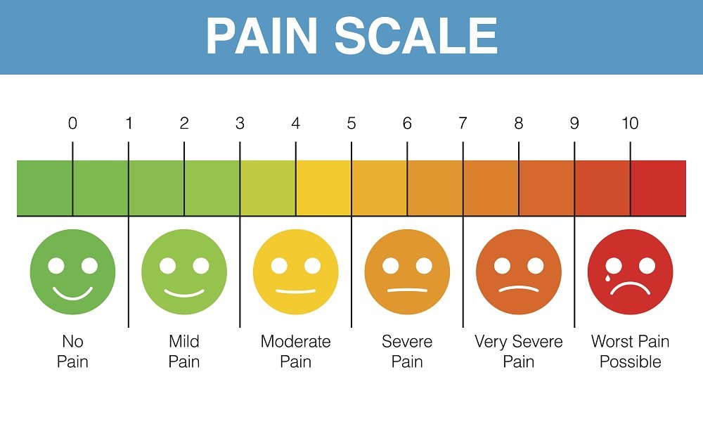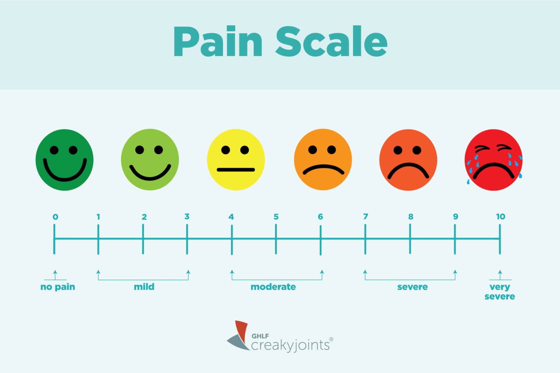 เป็นการประเมินความปวด โดยผู้ป่วยให้คะแนนความปวดด้วยตนเอง โดย 0 คือไม่ปวดเลย และ 10 คือ ปวดมากที่สุด แบ่งออกเป็นสามระดับได้แก่ 0-3 ไม่ปวดเลยหรือปวดเล็กน้อย 4-6 ปวดปานกลาง 7-10 ปวดมากที่สุด โดยส่วนใหญ่ผู้ป่วยจะมาพบแพทย์ด้วยความปวดประมาน 4-10 ยิ่งคะแนนความปวดมากขึ้นก็จะยิ่งส่งผลกระทบต่อชีวิตประจำวันของผู้ป่วยมากตามลำดับ ในทางแพทย์จีนมีการแบ่งความหมายและลักษณะอาการปวดออกเป็นหลากหลายรูปแบบ