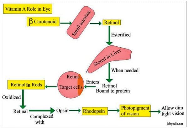 ตับมีหน้าที่หนึ่งคือ สะสมvitamin A ไว้ใช้งาน (95% ของทั้งร่างกาย นอกนั้นจะอยู่ในไต และ adrenal gland ) โดยเก็บไว้ในเซลล์ไขมัน Lypocyte ในรูป retinyl ester จากนั้นจะถูก Hydrolyseโดย Retinyl Esters เปลี่ยนเป็น Free Retinol และรวมกับ Retinol Blinding Protein เกิดเป็น Retinol RBP Complex นำไปใช้ต่อไป เนื่องจากvitamin A หากขาดไปจะทำให้ มองไม่เห็นในที่แสงน้อย (vitamin A ช่วยผลิตRhodopsin ซึ่งเป็นสารมีสีที่ไวต่อแสงในrod cell ที่เรติน่า) เยื่อบุตาแห้ง (vitamin A ช่วยบำรุง Epithelial Cellsให้หลั่งสารช่วยเรื่องความชุ่มชื้น) และเกิดอาการตาวุ้นในที่สุด ดังนั้นหากเกิดความผิดปกติที่ตับก็จะส่งผลต่อการมองเห็นเกิดเป็นอาการตาแห้ง ตาพร่ามัวได้นั่นเอง