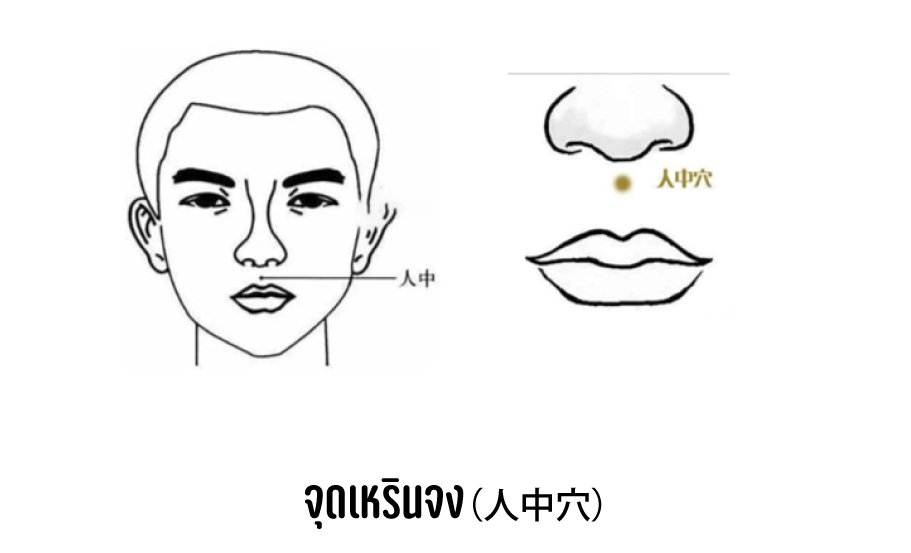 ตัวอย่าง เช่น การใช้จุดเหรินจง(บริเวณร่องเหนือริมฝีปากบน) รักษาอาการหมดสติ
