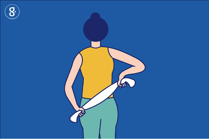 3) ท่ามือไขว้หลัง : ยื่นมือข้างที่เจ็บไพล่ไปข้างหลังระดับสะโพก โดยให้หลังมือหันเข้าหาสะโพก จับปลายผ้าขนหนูทั้งสองข้างจากด้านหลัง ใช้แขนข้างที่ไม่มีอาการออกแรงดึงผ้าขึ้นเพื่อยืดส่วนที่ติดขัด จะรู้สึกเจ็บเล็กน้อย แล้วปล่อยแขนข้างที่เจ็บให้หายตึง ทำซ้ำ10 ครั้งต่อวัน