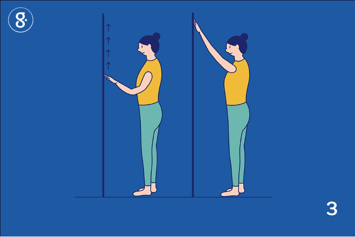 1) ท่าไต่กำแพง : ยืนหันหน้าเข้าฝ่าผนัง ห่างจากฝาผนังประมาณ 1 ฟุต ยกแขนข้างที่ติดไปข้างหน้าให้ศอกตรง ใช้นิ้วไต่ฝ่าผนังขึ้นไปเรื่อยๆ พยายามเลื่อนปลายนิ้วมือให้สูงขึ้น ด้วยการเดินเข้าหาฝาผนัง จนรู้สึกตึงหรือเจ็บเล็กน้อย จึงถอยหลังออกมา ทำซ้ำวันละ 10 ครั้งต่อวัน