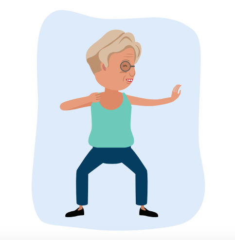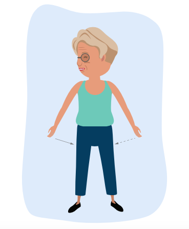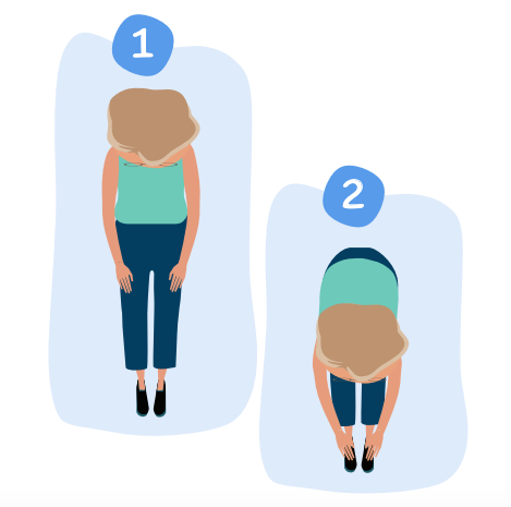 6.2 ยืนให้เท้าชิดกัน หายใจเข้า ก้มตัวลง โดยที่ขาเข่าและแขนตรง พยายามเอาปลายนิ้วแตะที่หัวแม่เท้ายกตัวขึ้นลงเล็กน้อย จากนั้นเงยหน้าขึ้นเล็กน้อย พร้อมกับหายใจออก