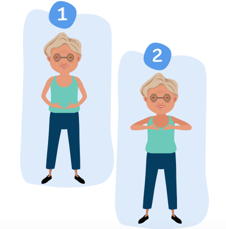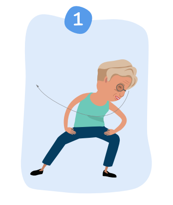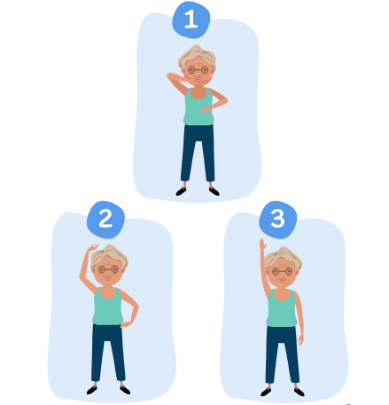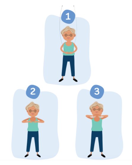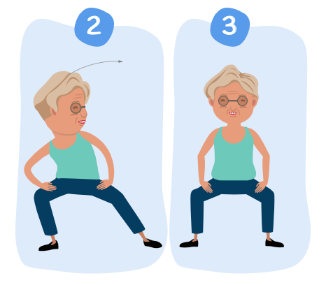 5.2 ค่อย ๆ หันศีรษะไปมองด้านหลังช้า ๆโดยขยับไปทั้งตัว เริ่มจากทางด้านซ้ายก่อน พร้อมกับค่อย ๆ หายใจเข้า พยายามหันไปมองด้านหลังให้มากที่สุด โดยอย่าบิดลำตัวหรือหัวไหล่ เสร็จแล้วหันกลับมาอยู่ในตำแหน่งเดิมช้า ๆ พร้อมผ่อนลมหายใจออก