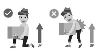 กิจกรรมที่ต้องงอขา งอหลัง แอ่นหลัง เช่น ยกของหนัก นำของลงจากที่สูง เป็นท่าทางที่กดทับเส้นประสาทภายในโพรง กระดูกสันหลัง ควรใช้รถเข็นขนของ เมื่อจะยกของหนักให้ ย่อเข่าลงแทนการก้มหลัง ดึงสิ่งของเข้าหาตัวและให้สัญญาณ กับตนเอง เมื่อจะนำของลงจากที่สูง ควรหลีกเลี่ยงการเหยียดหลัง ให้เหยียบบนเก้าอี้หรือบันไดแล้วจึงยกของลง งานบ้านที่ต้อง ก้มๆ เงยๆ จะรบกวนเส้นประสาท ควรปรับพฤติกรรมหรือใช้ อุปกรณ์ช่วย เช่น เมื่อดูดฝุ่นให้นั่งลง เมื่อยืนทำอาหารให้วาง เท้าข้างหนึ่งบนที่พักเท้า ปรับระดับเก้าอี้นั่งทำงานให้เหมาะสม เพื่อไม่ให้หลังงอ