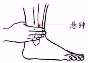 ใช้บรรเทาอาการตกหมอนที่เกิดบนเส้นลมปราณเส้าหยางบริเวณด้านข้างของลำคอ มักพบในคนที่นอนท่าตะแคง จุดเสวียนจงเป็นจุดฝังเข็มบริเวณขาด้านนอก เหนือยอดตาตุ่ม 3 ชุ่น ชิดขอบหน้าของกระดูก fibula