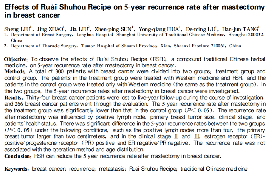 ในงานวิจัยกลุ่มที่ได้รับยาจีนและกลุ่มที่ไม่ได้รับยาจีน อัตราการกลับเป็นซ้ำและการแพร่กระจายในระยะ 5 ปี มีความแตกต่างอย่างมีนัยสำคัญ ดังนั้นจึงจำเป็นต้องได้รับยาจีนหลังการรักษาแผนปัจจุบัน สามารถยับยั้งการกลับเป็นซ้ำและการแพร่กระจายของมะเร็งเต้านมได้ ผู้ป่วยมะเร็งเต้านมหลังจากผ่าตัดได้รับยาจีนเป็นวิธีการรักษาที่สำคัญที่สามารถทำให้การพยากรณ์ของโรคดีขึ้นได้