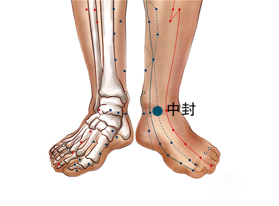 ![]() | จงเฟิง ZhongFeng 中封 จง แปลว่า ตรงกลาง เฟิง แปลว่า กองดิน จุดนี้อยู่บริเวณรอยบุ๋มข้อพับเท้าด้านหน้าของตาตุ่มด้านใน |