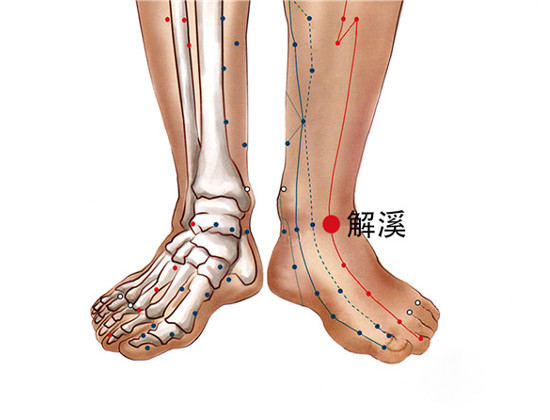 ![]() | เจี่ยซี JieXi 解溪 เจี่ย แปลว่า แยก ซี แปลว่า ลำธาร จุดนี้อยู่บริเวณรอยบุ๋มข้อพับเท้าด้านหน้า |