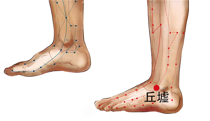 ![]() | ชิวซวี QiuXu 丘墟 ชิว แปลว่า เนินดิน ซวี แปลว่า เนินเขา จุดนี้อยู่บริเวณรอยบุ๋มขอบตาตุ่มด้านนอก |