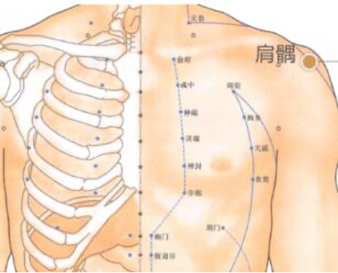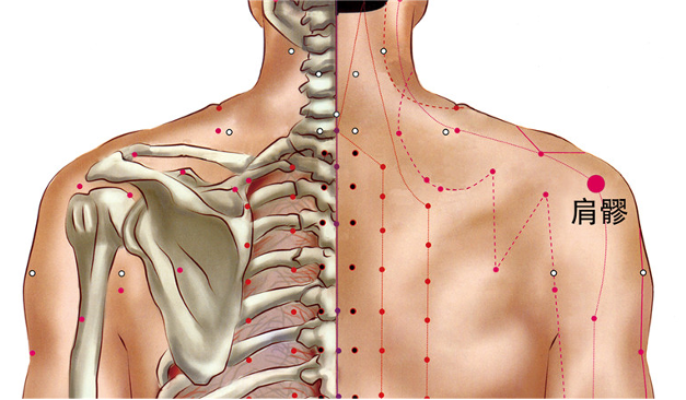 ![]() | เจียนเหลียว JianLiao 肩髎 เจียน แปลว่า ไหล่ เหลียว แปลว่า ร่อง จุดนี้อยู่บริเวณมุมหัวไหล่ด้านหลัง เมื่อกางแขนขึ้น 90 องศา จุดนี้อยู่ตรงรอยบุ๋มด้านหลังของไหล่ |