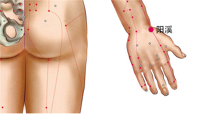 ![]() | หยางซี YangXi 阳溪 หยาง แปลว่า หยาง (อิน-หยาง) ซี แปลว่า ลำธาร จุดนี้อยู่บริเวณหลังข้อมือ เมื่อกำมือชูนิ้วโป้งขึ้น จุดนี้อยู่ที่ร่องรอยบุ๋มฝั่งนิ้วโป้ง |