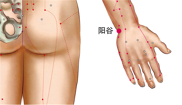 ![]() | หยางกู่ YangXi 阳谷 หยาง แปลว่า หยาง (อิน-หยาง) กู่ แปลว่า หุบเขา จุดนี้อยู่บริเวณหลังข้อมือ ร่องข้อมือด้านนอกฝั่งนิ้วก้อย |