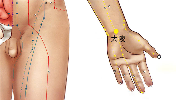 ![]() | ต้าหลิง DaLing 大陵 ต้า แปลว่า ใหญ่ หลิง แปลว่า เนินดิน จุดนี้อยู่บริเวณกลางเส้นข้อมือด้านใน |