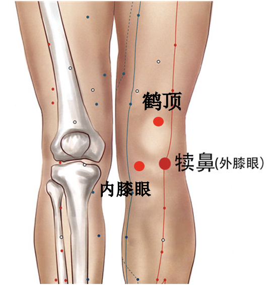 ![]() | เห้อติ่ง HeDing 鹤顶 อยู่บริเวณเหนือเข่า ตรงรอยบุ๋มกึ่งกลางขอบบนของกระดูกสะบ้า |