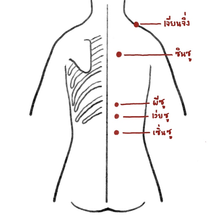 ผีซู(BL20, 脾俞): บนหลัง ระดับขอบล่างปุ่มกระดูกสันหลังอกที่ 11 ข้างแนวกึ่งกลางตัว 1.5 ชุ่น