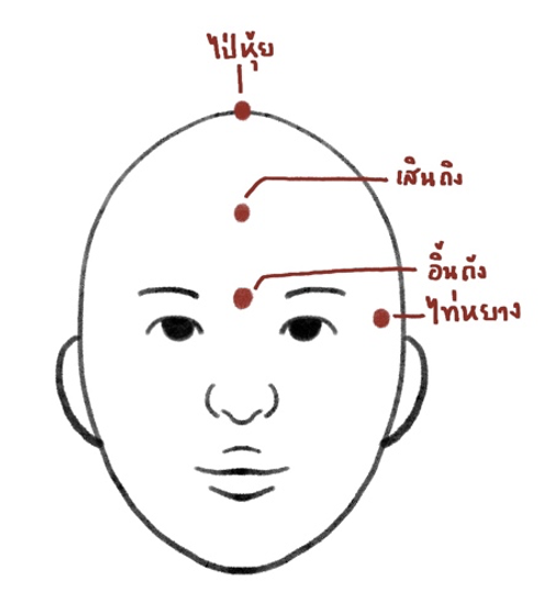 อิ้นถัง(EX-HN3, 印堂): อยู่บนแนวกึ่งกลางลำตัว อยู่กึ่งกลางหัวคิ้วทั้งสองข้าง