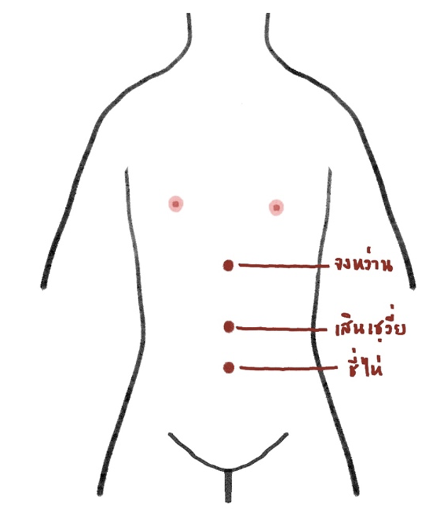 จงหว่าน(CV12, 中脘): อยู่กึ่งกลางลำตัวระหว่างหัวนมและสะดือ