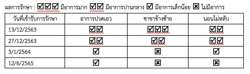 ในช่วงระยะเวลาวันที่ 13/12/2563 - 12/6/2565 ผู้ป่วยเข้ารับการรักษา 1-2 สัปดาห์/ครั้ง โดยในช่วง 20 ครั้งแรก ผู้ป่วยเข้ารับการรักษา 1 ครั้ง/สัปดาห์ บางช่วงที่อาการดีขึ้นค่อนข้างชัดเจนเข้ารับการรักษา 2 สัปดาห์/ครั้ง ผู้ป่วยเข้ารับการรักษาอย่างต่อเนื่องจนถึงปัจจุบัน ปัจจุบันความต่อเนื่อง 2 สัปดาห์/ครั้ง อาการดีขึ้นอย่างต่อเนื่อง เนื่องจากการทำงานจึงหลีกเลี่ยงการยกของหนักได้ยาก ดังนั้นจึงอาจมีอาการปวดหลังส่วนเอวบ้าง แต่เมื่อมีอาการปวดจะฟื้นตัวได้เร็วและสามารถทำงานได้นานกว่าปกติกว่าจะเริ่มมีอาการปวด ส่วนอาการชาและนอนไม่หลับดีขึ้นอย่างเห็นได้ชัด เมื่อผู้ป่วยสามารถนอนหลับได้ดี อาการปวดและชาดีขึ้น ทำให้ร่างกายได้รับการบำรุงอย่างเต็มที่ สามารถรับประทานอาหารได้มากยิ่งขึ้น ส่งผลให้ค่าดัชนีมวลกาย BMI (Body Mass Index : BMI คือมาตรการที่ใช้ประเมินภาวะอ้วนและผอมในผู้ใหญ่) จาก 17.22 เพิ่มขึ้นเป็น 18.50 การมีน้ำหนักตัวที่มากขึ้น ส่งผลให้ร่างกายมีชั้นไขมันและกล้ามเนื้อที่หนาขึ้น ช่วยป้องกันเครื่องมือยึดข้อกระดูกสันหลังสัมผัสกับพนักพิงเก้าอี้เวลาผู้ป่วยนั่งพิงพนักพิงเก้าอี้ได้เป็นอย่างดี