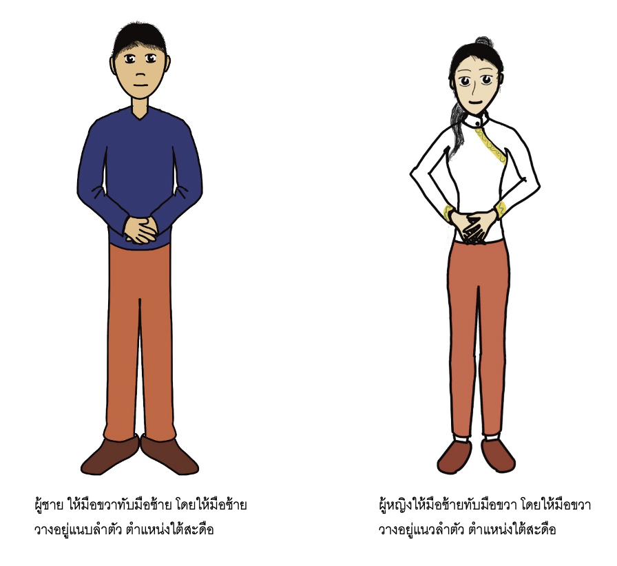 เริ่มจากเอามือประสาทไว้ช่วงเอวและลูบมือไปยังด้านหลัง ประคองเอวไว้ขณะเงยหน้าให้มาสุดเท่าที่ทำไหว จากนั้นจึงก้มตัว แขนสองข้างเหยียดฝ่ามือแบบหันเข้าด้านใน บิดลำตัวไปทางขวายกไหล่ขึ้น และบิดลำตัวด้านซ้ายยกไหล่ขึ้น เหยียดแขนสองข้างหงายฝ่ามือออกด้านนอกให้หลังมือชนกันและลุกขึ้นยืนตรง มือสองข้างอยู่ระดับหน้าอก หันฝ่ามือเข้าหาลำตัววางไว้ที่ตำแหน่งใต้สะดือ ทำซ้ำ 3 ครั้ง