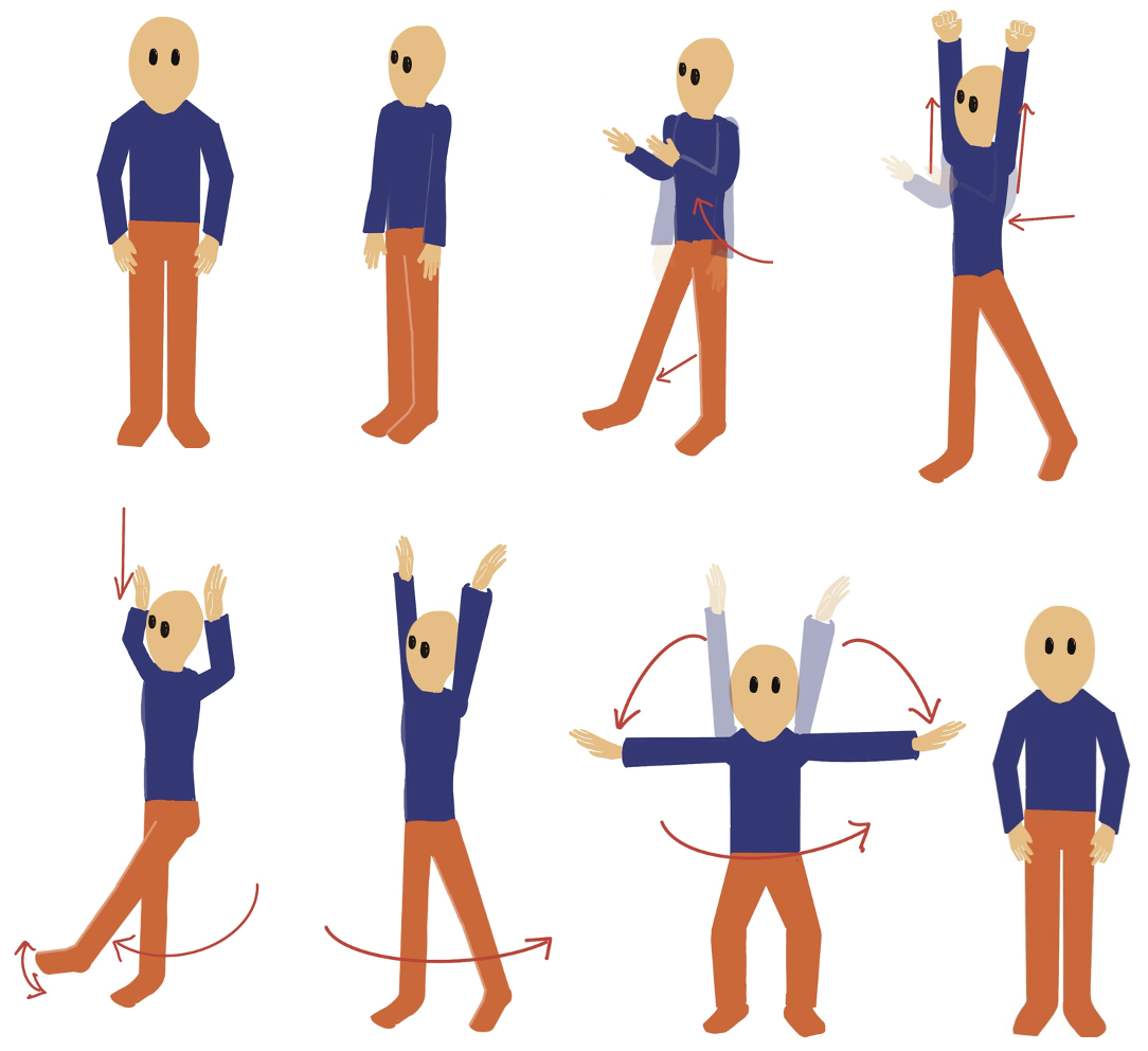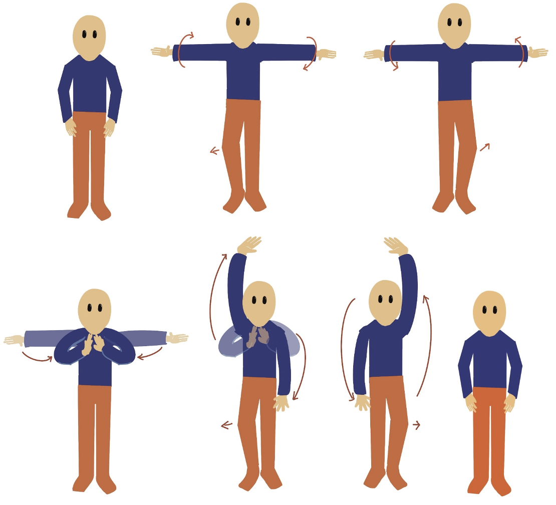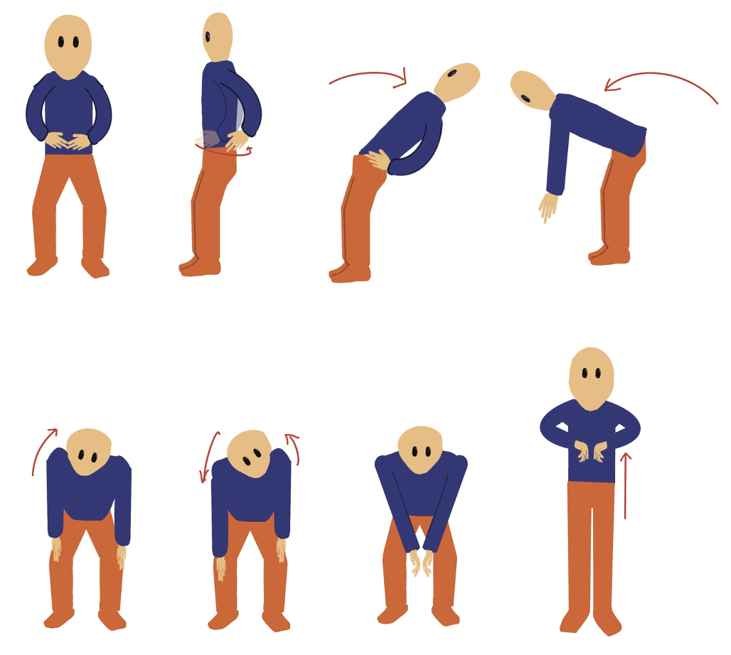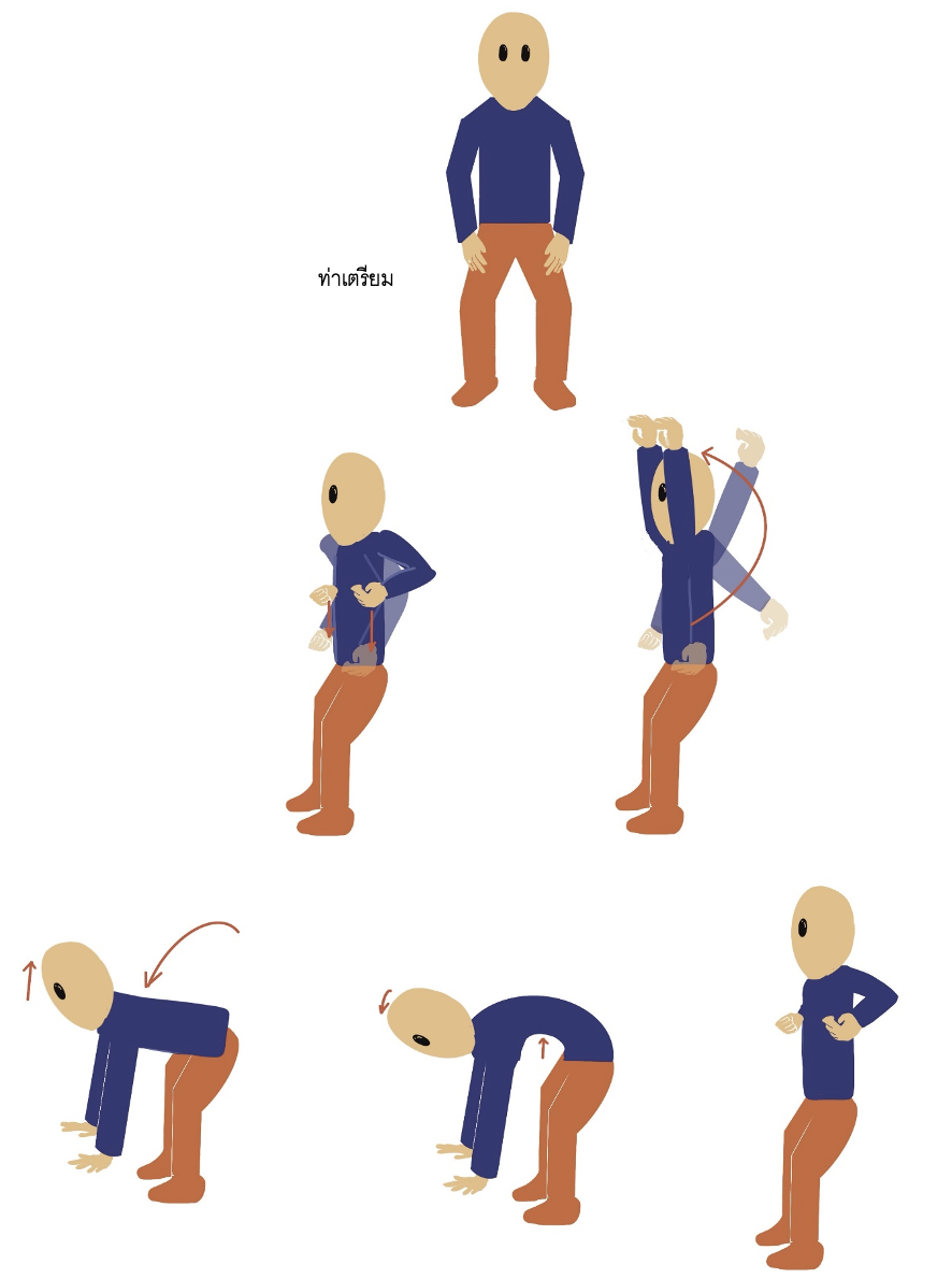ยืนกางขาสองข้างระดับหัวไหล่ ย่อตัวลงเล็กน้อย มือสองข้างวางที่ต้นขา กำมือสองข้างและยกมือขึ้นตำแหน่งบริเวณชายโครงทั้งสองข้าง เหยียดแขนลงและหมุนแขนไปทางด้านหลัง และขึ้นเหนือหัว ก้มตัวลง แบมือหันฝ่ามือลงพื้นสองข้าง เหยียดแขนตรง เงยหน้าขึ้น ก้มหน้าลงพร้อมกับแอ่นตัวให้หลังงอขึ้น เงยหน้าขึ้นหลังตรง มือสองข้างกำหมัดอยู่บริเวณชายโครงทั้งสองข้าง ทำซ้ำ 3 ครั้ง