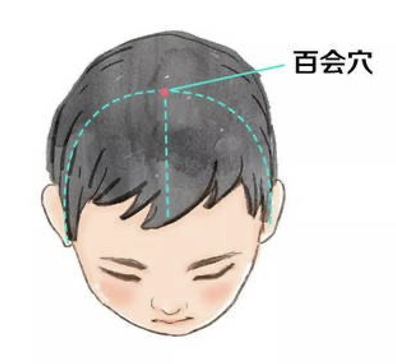百会 ไป่หุ้ย (Baihui, GV20) ตำแหน่งอยู่จุดกึ่งกลางศีรษะ สามารถหาได้จากเส้นกลางจมูกลากขึ้นมา และยอดปลายหูลากมาบรรจบที่จุดกึ่งกลางศีรษะ