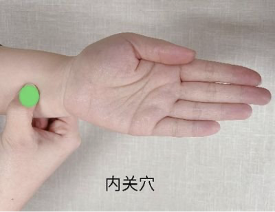 内关 เน่ยกวน (Neiguan, PC6) ตำแหน่งอยู่กึ่งกลางข้อมือด้านในขึ้นมา 2 ชุ่น