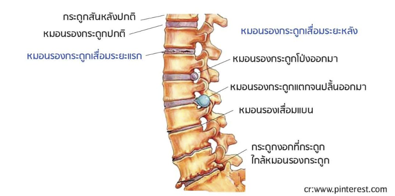กระดูกสันหลังของคนเรานั้นตั้งแต่ช่วงคอลงมาจนถึงกระดูกกระเบนเหน็บจะมี ”หมอนรองกระดูก” ทำหน้าที่เพิ่มความยืดหยุ่นและช่วยให้ร่างกายเคลื่อนไหวได้ โดยที่ด้านในของหมอนรองกระดูกจะมีเนื้อเยื่อที่มีน้ำเป็นส่วนประกอบค่อนข้างเยอะจึงทำให้มีความยืดหยุ่นที่ดี และซับแรงกระแทก ส่วนด้านนอกจะมีลักษณะที่แข็งเพื่อเสริมความแข็งแรงให้หมอนรองกระดูก การทำงานของหมอนรองกระดูกนั้นจะช่วยในการถ่ายเทน้ำหนัก ถ้าหากเราก้มตัวไปทางด้านหน้า หมอนรองกระดูกจะถูกด้านไปทางด้านหลัง ถ้าเราแอ่นตัวไปทางด้านหลัง หมอนรองกระดูกจะถูกด้านไปทางด้านหน้า ทางด้านหน้าของหมอนรองกระดูกจะมีเส้นเอ็นชิ้นใหญ่ประคองให้หมอนรองกระดูกอยู่ในตำแหน่งที่ถูกต้อง ด้านหลังก็จะมีเส้นเอ็นที่เล็กและบางกว่าด้านหน้า และมีเส้นประสาทที่ยื่นออกมาจากไขสันหลังพาดผ่าน หมอนรองกระดูกจะมีการเสื่อมสภาพไปตามการใช้งาน และการดูแลสุขภาพของแต่ละคน ถ้าเกิดอุบัติเหตุ หรือการทำงาน หรือใช้แรงงานมากเกินไปจะทำให้หมอนรองกระดูกจะเสื่อมสภาพลงได้ และทำให้เกิดอาการต่าง ๆ ตามมาได้ ได้แก่ อาการปวดคอ บ่า หลัง และเอว ปวดหัว ปวดท้ายทอย อาการชามือ ชาเท้า แขนขาอ่อนแรง ปวดร้าว การขับถ่ายอุจจาระปัสสาวะติดขัด จนถึงขั้นกล้ามเนื้อฝ่อลีบ เป็นต้น
