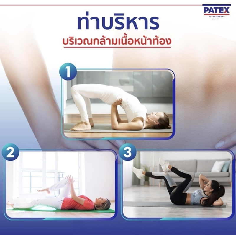ท่าที่ 1 : เริ่มต้นด้วยท่านอนหงาย ชันเข่าสองข้างขึ้นมา แล้วเอามือสอดไว้ใต้บริเวณช่วงเอว จากนั้นเกร็งหน้าท้อง พร้อมกับยกก้นให้ลอยขึ้นจากพื้นเล็กน้อย เมื่อทำแล้วจะต้องรู้สึกได้ว่า แผ่นหลังมีการกดทับลงบนมือที่อยู่ใต้เอวด้วย แล้วค้างไว้ นับ 1-10 ทำแบบนี้วนไปให้ครบ 10 ครั้งจะเท่ากับ 1 เซต และวันหนึ่งควรทำให้ได้ 2-3 เซต