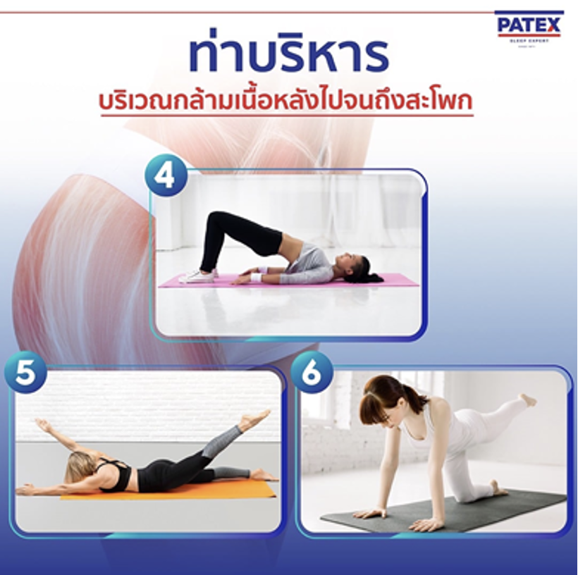 ท่าที่ 4 : ท่านี้จะคล้าย ๆ กับท่าที่ 1 คือ เริ่มด้วยการนอนหงายและชันเข่าสองข้างขึ้น นำแขนวางไว้ข้างลำตัว ค่อย ๆ เกร็งแผ่นหลังเพื่อยกก้นให้ลอยพ้นพื้น เกร็งค้างไว้พร้อมนับ 1-10 และทำซ้ำวนไป อาจไม่ต้องถึง 3 เซตต่อวัน เพราะท่านี้หลังไม่มีแรงช่วยดันจากมือเหมือนท่าแรก จึงอาจทำให้ใช้กำลังมากกว่า