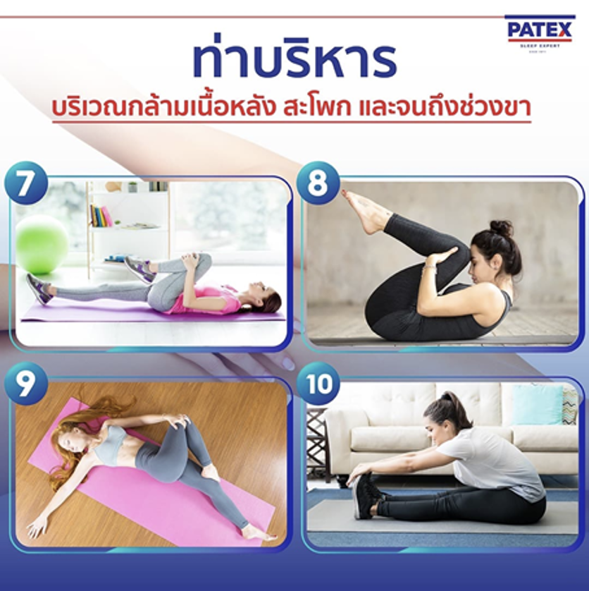 ท่าที่ 9 : นอนหงาย ชันเข่าสองข้างขึ้นมา แล้วยกขาซ้ายขึ้นมาทับไขว้บนขาขวา จากนั้นใช้มือขวาโน้มหัวเข่าซ้ายให้เอนไปทางด้านขวามือ โดยควรเอนลงไปอยู่ในแนวราบให้มากที่สุด และพยายามให้ลำตัวยังคงแนบติดอยู่กับพื้น นับค้างไว้ 1-10 จากนั้นสลับข้าง ทำซ้ำแบบเดิม