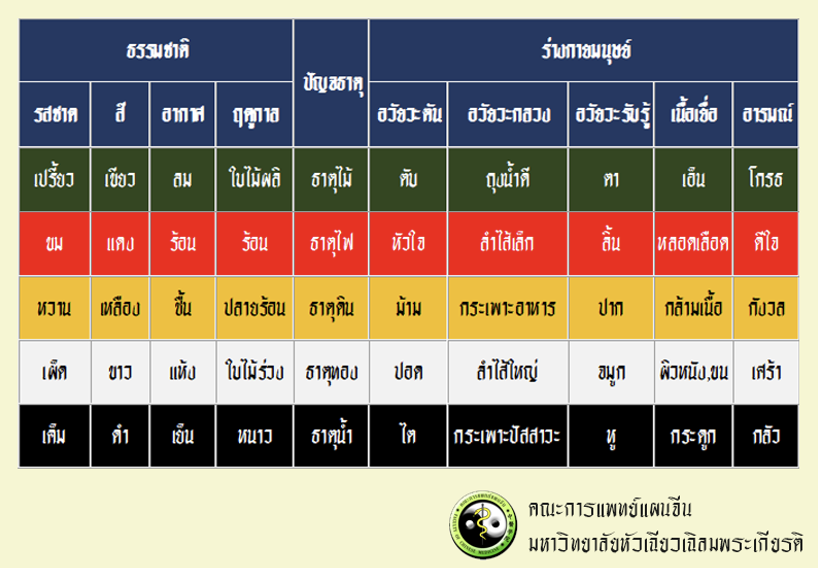 ทฤษฎีปัญจธาตุ(五行学说)ได้แก่ ธาตุไม้ ไฟ ดิน โลหะ น้ำ ในทางการแพทย์แผนจีนถือว่า ปัญจธาตุเป็นองค์ประกอบอยู่ในสิ่งต่าง ๆ ทำให้สิ่งทั้งหลายมีลักษณะ คุณสมบัติ ปฏิกิริยา และรูปร่างต่าง ๆ กันไป รวมทั้งสาเหตุให้มีการเปลี่ยนแปลงต่าง ๆ เกิดขึ้น