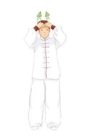 นำมือทั้งสองแนบชิดใบหน้า โดยแขนก็แนบติดกับอกส่วนบน จากนั้นใช้แรงเล็กน้อยถูจากด้านล่างขึ้นสู่ด้านบนถึงบริเวณหางคิ้ว นิ้วโป้งชิดใบหูด้านหลัง ถูขึ้นลงไปมา 6-12 ครั้ง เสร็จแล้ว ใช้นิ้วกลางกดคลึงบรืเวณร่องจมูกทั้งสองข้างเล็กน้อย และนิ้วโป้งทั้งสองกดคลึงหลังใบหูเล็กน้อยเช่นกัน คลึงไปมา 6-12 ครั้งเช่นกัน