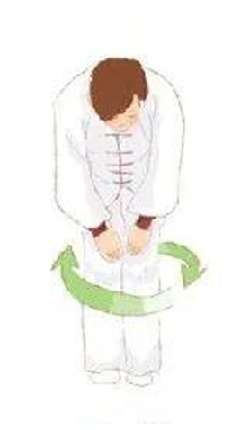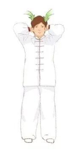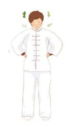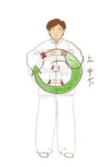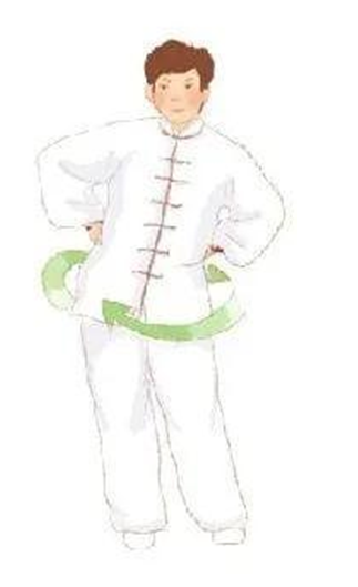 นำหลังมือขวาวางบริเวณเอวส่วนล่าง ใช้มือซ้ายวางบริเวณต้นคอ โดยใกล้กระดูกต้นคอที่นูนที่สุดหรือใกล้ จุดต้าจุย (大椎穴,DU14 ) จากนั้นให้ถูไปมา 6-12 ครั้ง สลับข้างทำซ้ำ 6-12 ครั้งเช่นกัน