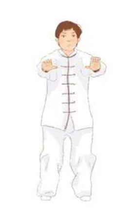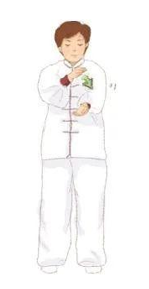 ยืนแยกเท้าทั้งสองให้อยู่ในระดับเดียวกับหัวไหล่ แขนทั้งสองยื่นออกมาระดับอกฝ่ามือหันลงล่างอย่างเป็นธรรมชาติ จากนั้นหายใจเข้า ค่อยๆยกแขนขึ้นสูงกว่าไหล่ได้เล็กน้อย แขนทั้งสองค่อยๆดึงกลับเข้าหาอก จากนั้นใช้มือดันไปด้านหน้าและค่อยๆหายใจออก ทำซ้ำต่อเนื่อง 3-6 ครั้ง