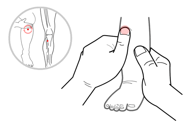 ตำแหน่ง อยู่ใต้กระดูกหัวเข่า 3 ชุ่น (3 ชุ่น คือความกว้างของนิ้วชี้ นิ้วกลาวง นิ้วนาง นิ้วก้อยของเด็ก)