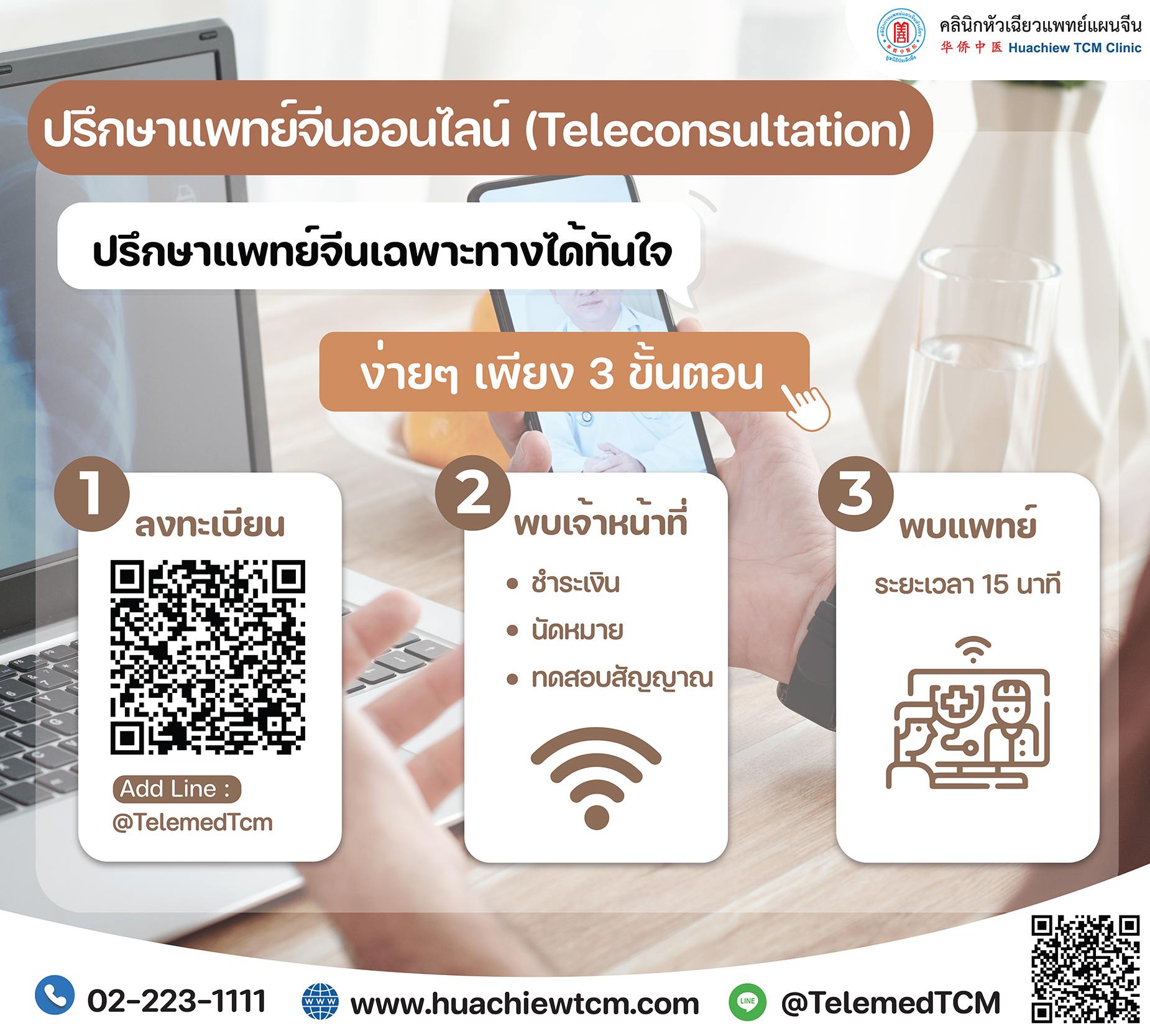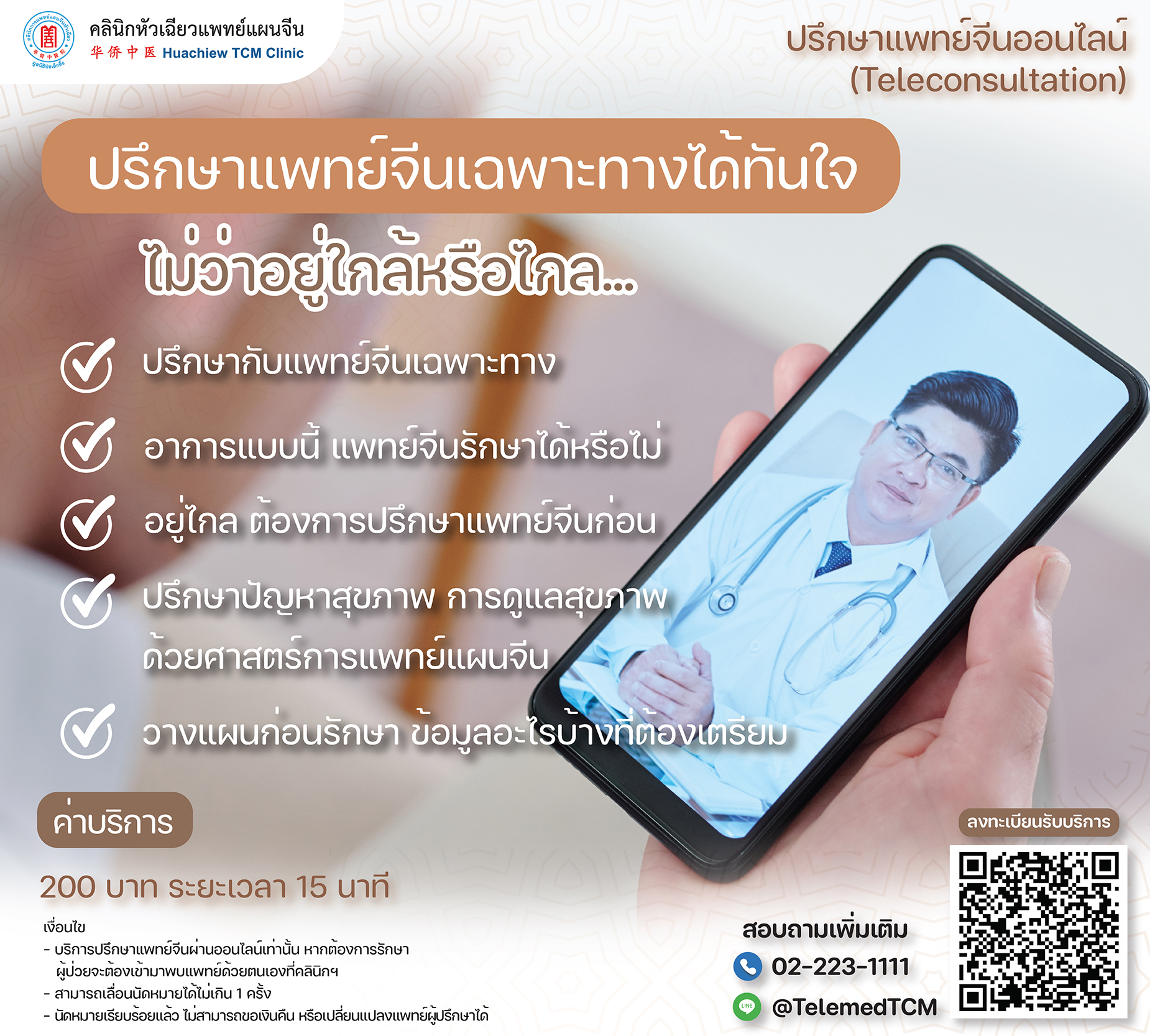 1.บริการปรึกษาแพทย์จีนออนไลน์ Teleconsultation เป็นเพียงการปรึกษาแพทย์ หากต้องการรักษาผู้ป่วยจะต้องเข้ามาพบแพทย์ด้วยตนเองที่คลินิกฯ (เฉพาะคนไข้ใหม่)