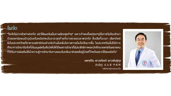 “โรคไตไม่น่ากลัวเท่าฟอกไต อย่าให้หมอจีนเป็นทางเลือกสุดท้าย” คุณหมอกล่าวย้ำว่าไม่อยากให้แพทย์แผนจีนเป็นทางเลือกสุดท้ายเพราะถ้าพบตั้งแต่แรกๆ มีโอกาสที่ไม่ต้องรักษาด้วยแพทย์แผนปัจจุบันหรือแม้แต่พบในระยะสุดท้ายก็อาจชะลอเวลาฟอกไต ซึ่งเสียทั้งเวลา เสียทั้งทรัพย์ ยิ่งในประเทศไทยที่อาหารรสชาติค่อนข้างจัดจ้านยิ่งเพิ่มโอกาสการเป็นโรคไตมากขึ้น ในประเทศจีนนั้นได้มีการศึกษาการรักษาโรคไตทั้งในมนุษย์หรือสัตว์เพื่อให้ได้ผลการรักษาที่มีประสิทธิภาพและนักศึกษาแพทย์จีนหลายคนก็ได้รับการส่งเสริมให้นำความรู้การรักษาในทางแผนจีนกลับมาช่วยเหลือผู้ป่วยที่ไทยจึงอยากให้ลองเปิดใจ